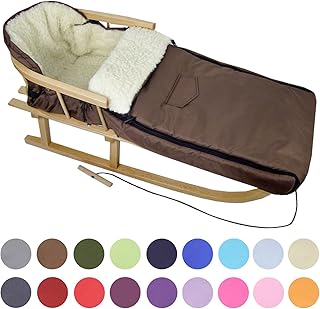 BambiniWelt24 BAMBINIWELT Kombi-Angebot Holz-Schlitten mit Rückenlehne & Zugseil + universaler Winterfußsack (90cm), auch geeignet für Babyschale, Kinderwagen, Buggy, aus Wolle Uni (Braun)