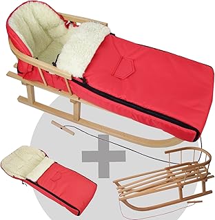BambiniWelt24 BAMBINIWELT Kombi-Angebot Holz-Schlitten mit Rückenlehne & Zugseil + universaler Winterfußsack (90cm), auch geeignet für Babyschale, Kinderwagen, Buggy, aus Wolle Uni (Rot)