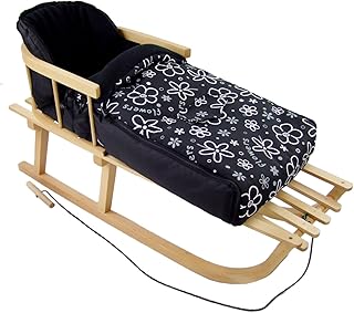 Rawstyle *Kombi-Paket* Holz-Schlitten mit Rückenlehne & Zugseil + universaler Winterfußsack (90cm) Fleece, auch geeignet für Babyschale, Kinderwagen, Buggy (Flowers Schwarz)