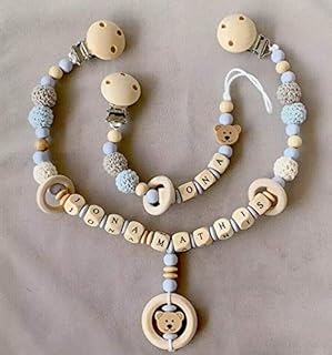 Kinderwagenkette Und Schnullerkette Mit Namen Set Häckelperle Teddy blau
