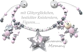 Kinderwagenkette mit Namen Mädchen rosa grau Teddy Knisterstern