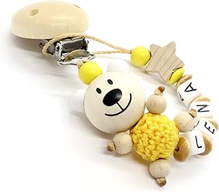 Schnullerkette mit Namen für Mädchen und Jungen - VIELE MODELLE - Personalisierte Schnullerkette (Bär-Gelb-Stern)